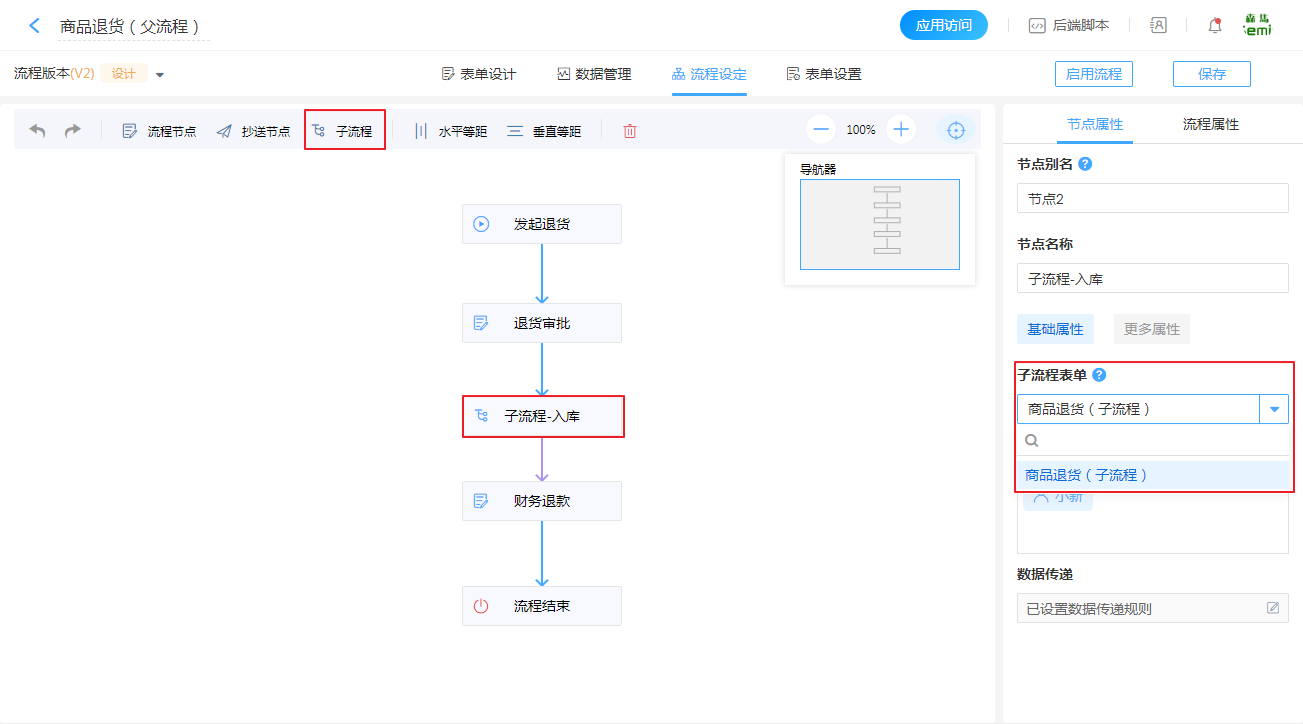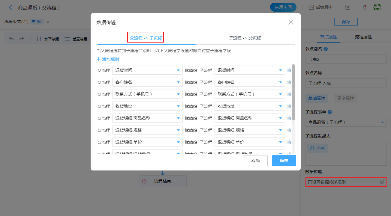 首先,我们设置父流程到子流程的数据传递规则。如销售退货场景中,将退货明细传递到子流程中,方便取货员完成产品的确认及数量的校对。