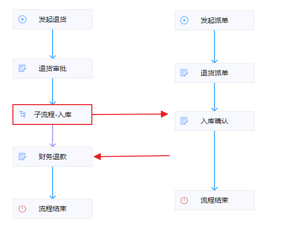 如:销售场景,一个订单发起退货后需要进行派单取货,再进行退货入库,当商品完成入库后才执行最终的财务退款操作,那么我们就可以将退货派单入库这一部分业务拆分到子流程里去处理。当子流程完成入库操作以后,回到父流程里进行财务退款审批,完成最终的退货退款流程。