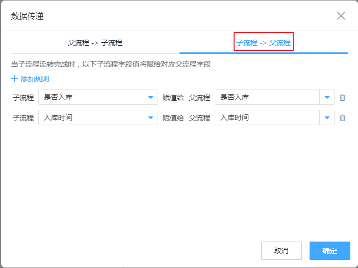 设置好父子流程的传递规则后,还可以设置子流程到父流程的传递规则。如产品入库后把是否入库及入库时间等数据再传递到父流程中,财务即可根据是否完成入库来进行退款操作。
