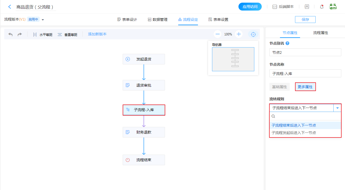 通过设置父流程到子流程的「流转规则」可以规定父子流程间同步或异步的流转关系。
