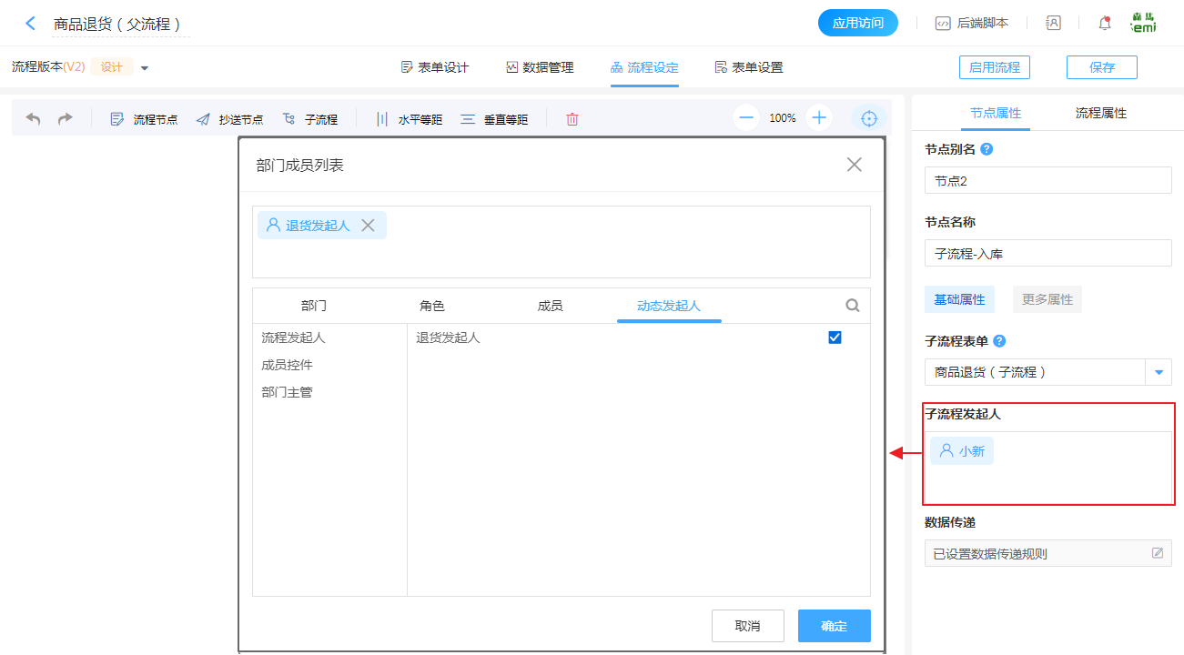 2. 由于子流程是自动发起的,选择完作为子流程流转的表单后,需要设置子流程的流程发起人。流程发起人可以是父流程的流程发起人、固定的某个成员、动态的成员字段等。
