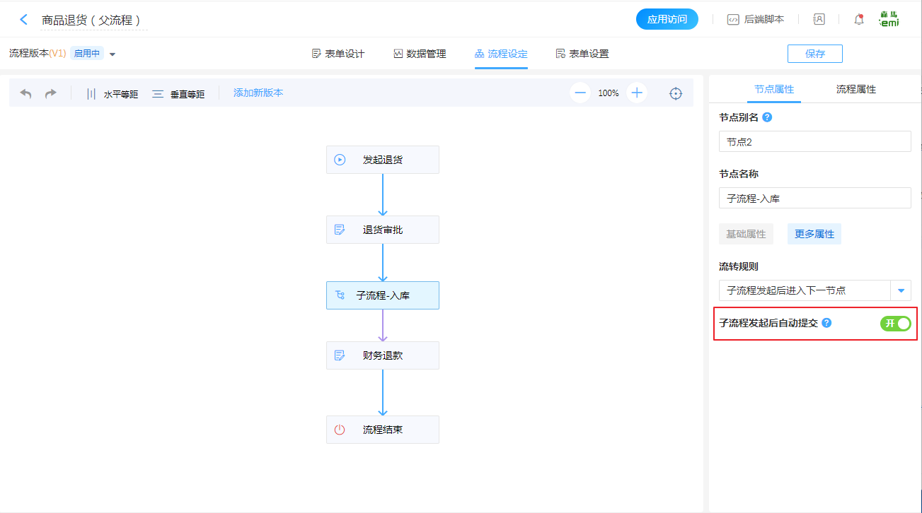若开启了子流程发起后自动提交,则自动为发起人创建子流程,不需要发起人再处理,直接跳过发起节点,进入后续审批节点。