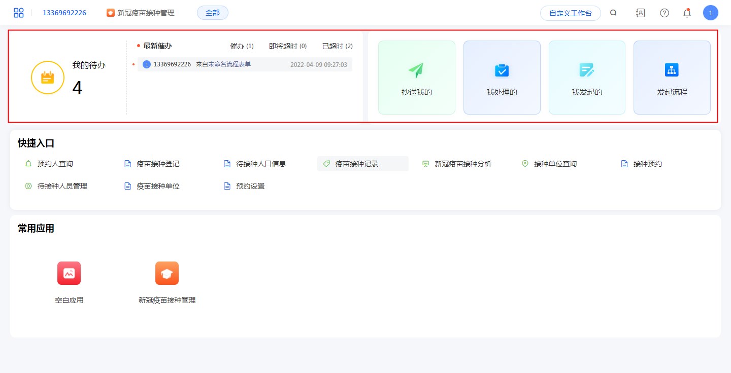 用户被共享的表单中如果有启用流程的,或者用户有待办的流程时,进入工作台后就会显示流程的相关信息。