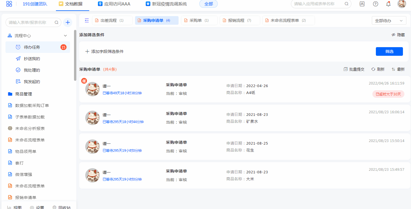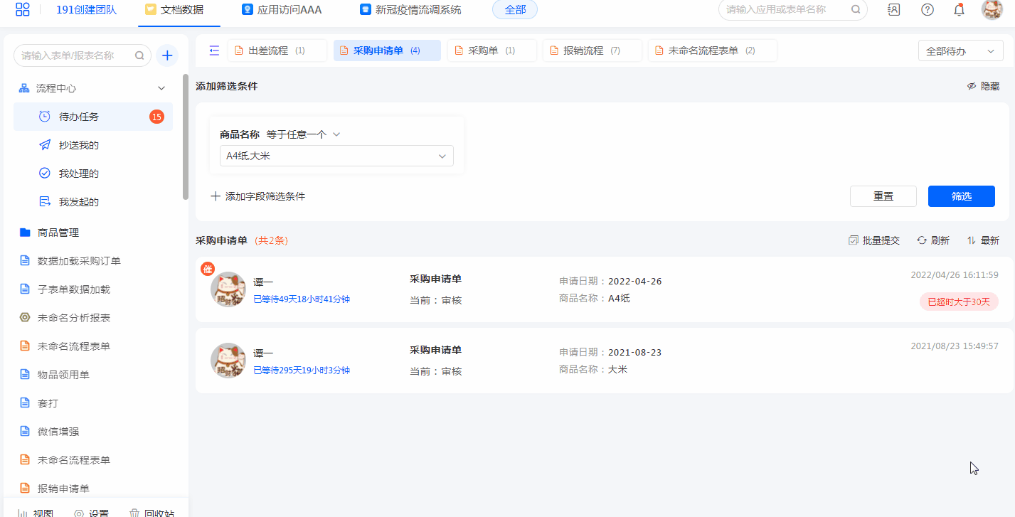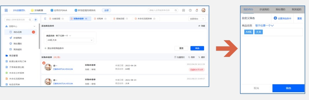 若流程数据过多,无法直接找到需要的待办任务;在待办任务、抄送我的、我处理的和我发起的列表中,都可以通过搜索和筛选条件快速定位自己所需要的流程数据。