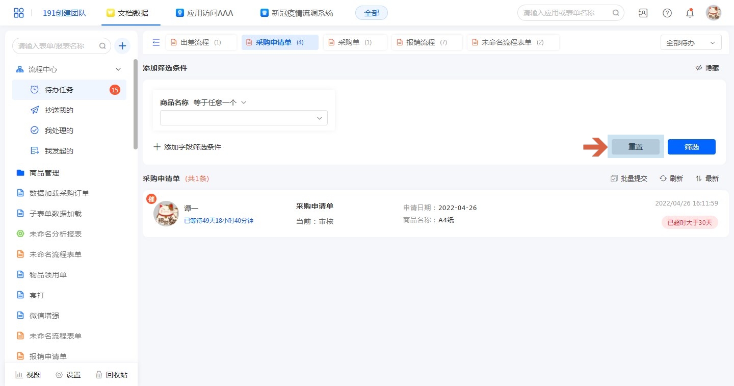 • 筛选条件会自动缓存,下次进入流程待办时自动填入上次的填入的筛选条件。