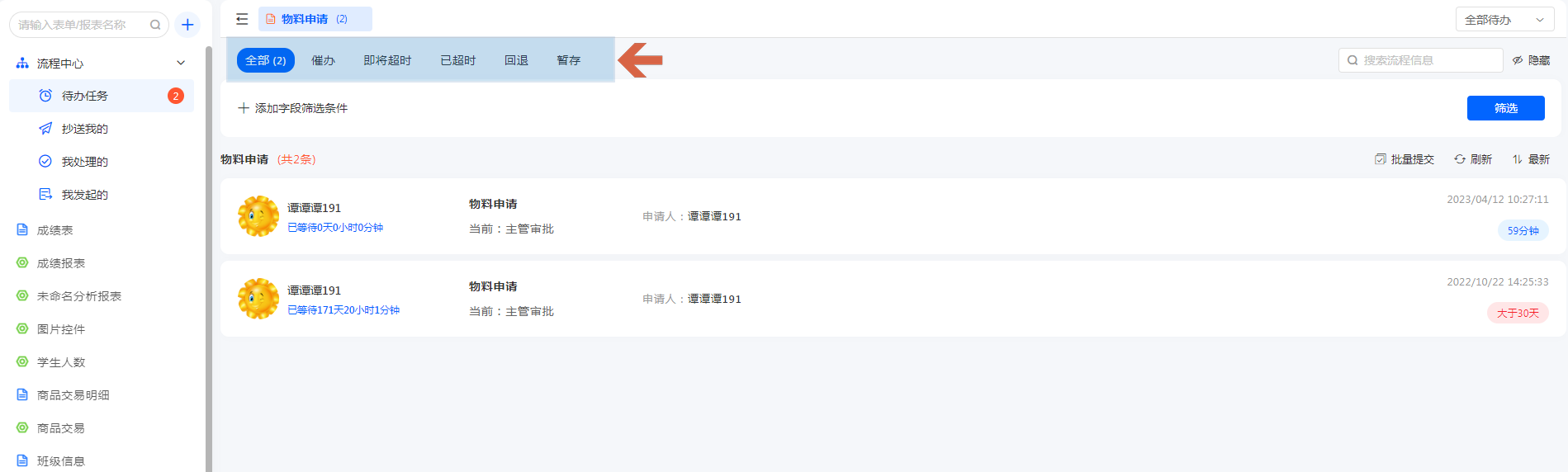 • 全部:当前流程表单下所有我处理的流程,并显示数量。