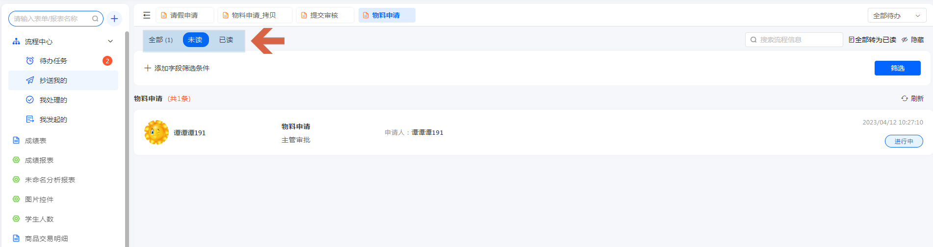 • 未读:抄送了我但是还没有点击详情查看的流程。