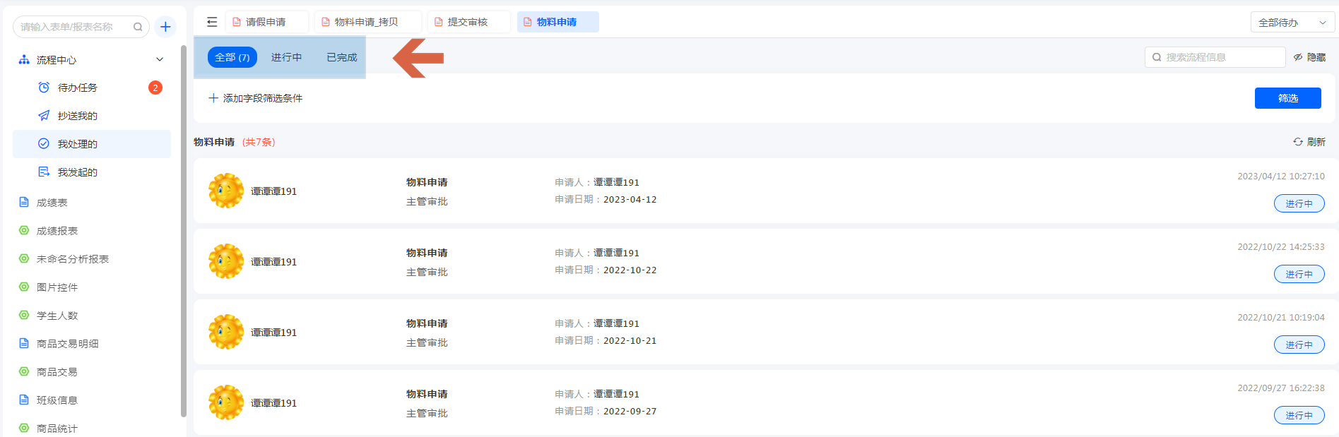 • 全部:当前流程表单下所有我发起的流程,并显示数量。
