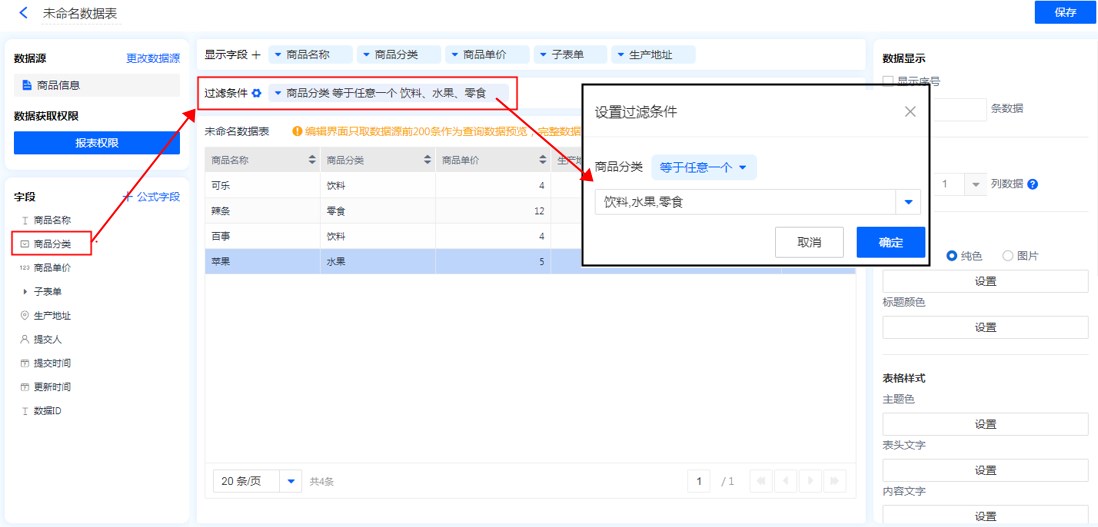 • 表单:使用表单作为数据表的数据源,可通过设置报表权限,对源数据进行新增、编辑、修改、删除数据。