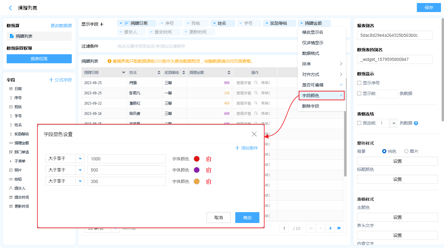 • 字段颜色:字段支持更改颜色,可设置条件对字段进行