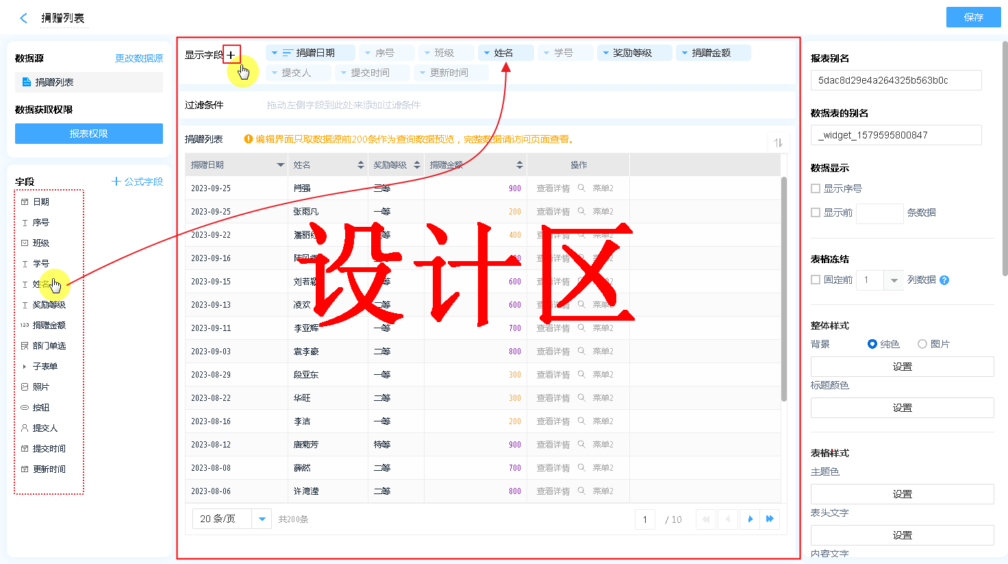 数据表的设计区分为 显示字段、过滤条件以及数据显示区。