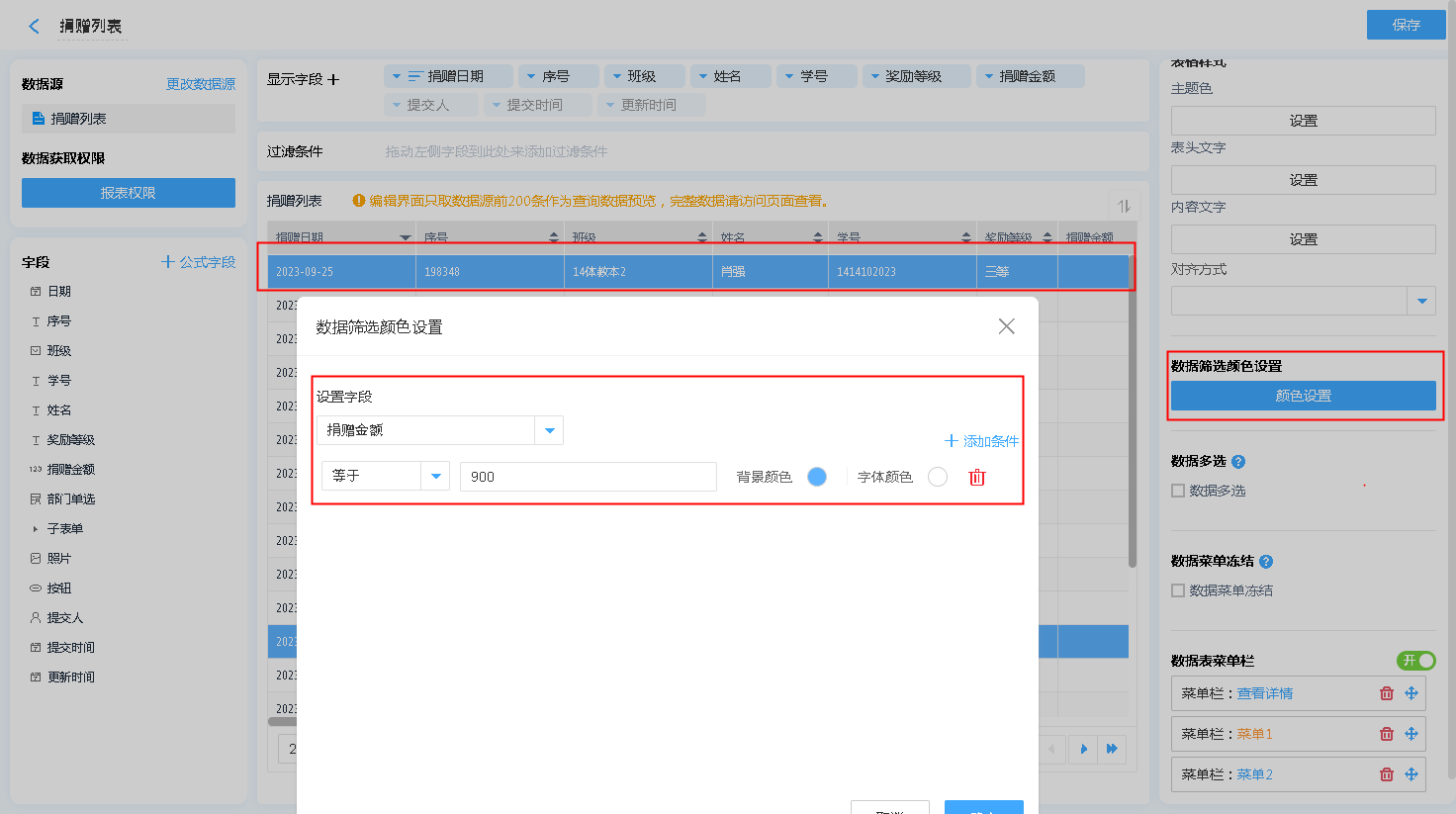 除了可以通过上面的样式对数据表显示的内容进行调整,还可以通过设置数据筛选颜色,高亮需要进行额外标注的信息