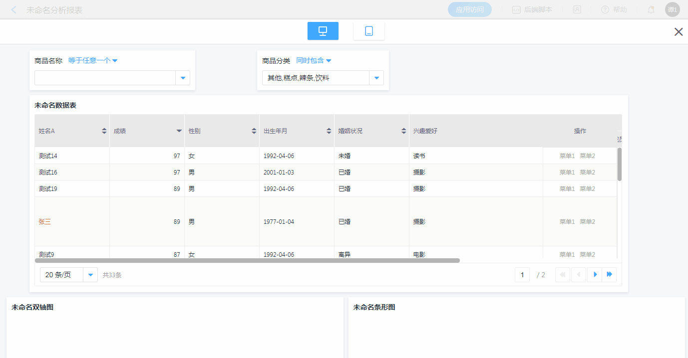 平台的报表体系,支持报表菜单,在报表的表头上方,支持添加自定义按钮,可对接功能插件、数据助手或者弹出表单、报表。