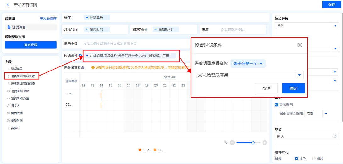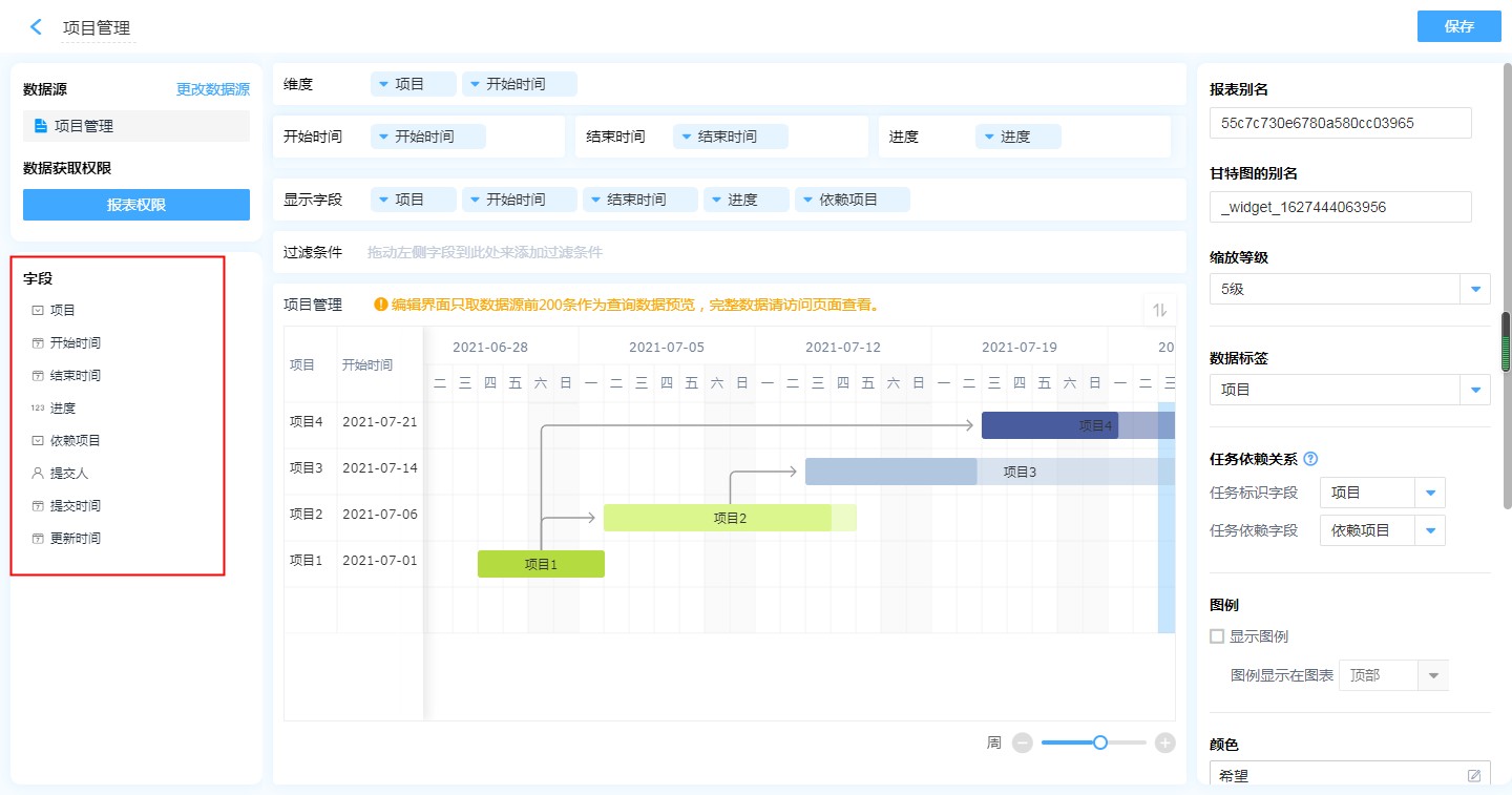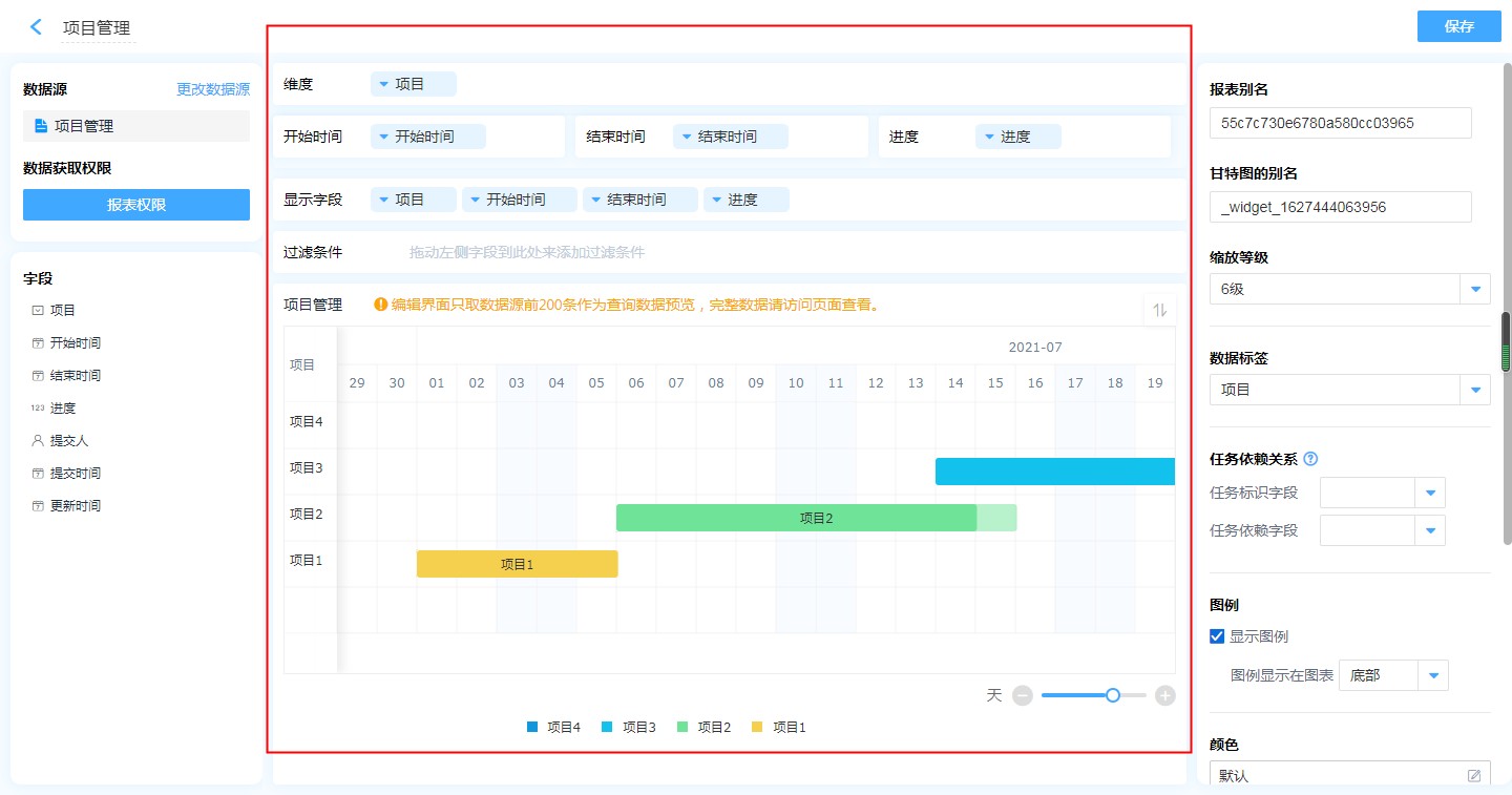 甘特图的设计区分为 维度、开始时间&结束时间、进度、显示字段、过滤条件以及数据显示区。