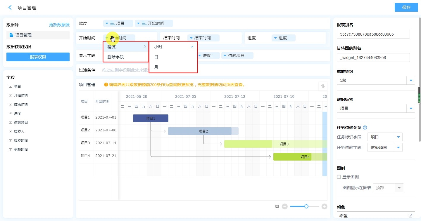 • 精度:可以设置小时、日、月。开始时间&结束时间根据其精度取值,如开始时间实际值时2021-07-28 19:00:00,开始时间精度设置日,那么开始时间取值2021-07-28。