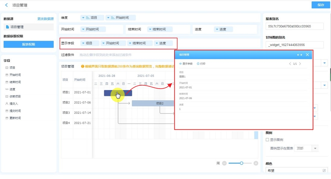 点击甘特图的任务时,会弹出表单,显示字段指在此表单中显示的字段。