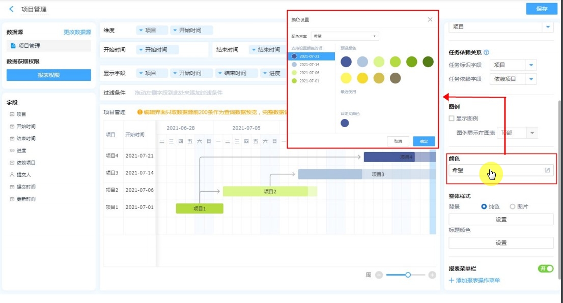 支持自定义图表的配色,优化各个数据的展示。可选择现有的配色方案,或者自定义每项的颜色。