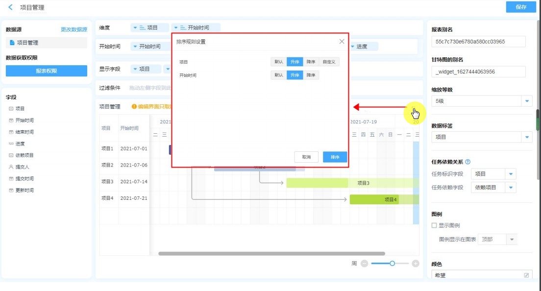 • 排序:支持按照指定的格式(升序、降序、自定义排序)对甘特图内的数据进行排序。