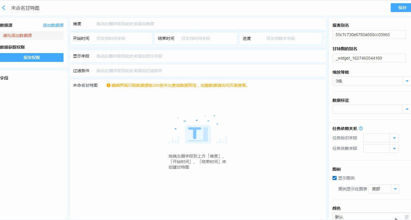 3、设计甘特图,修改甘特图名称、添加数据源、设置【维度】&【开始时间】&【结束时间】。