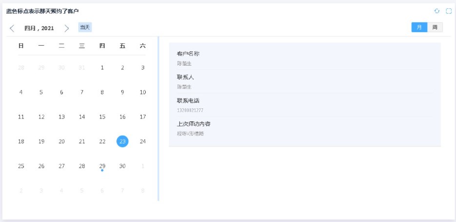 日历表适合将重要的日期进行提醒的场景,如:客户拜访管理中,与预约拜访有关的两张报表中就利用日历表的功能,清晰展示什么时间,将有需要执行的拜访任务。
