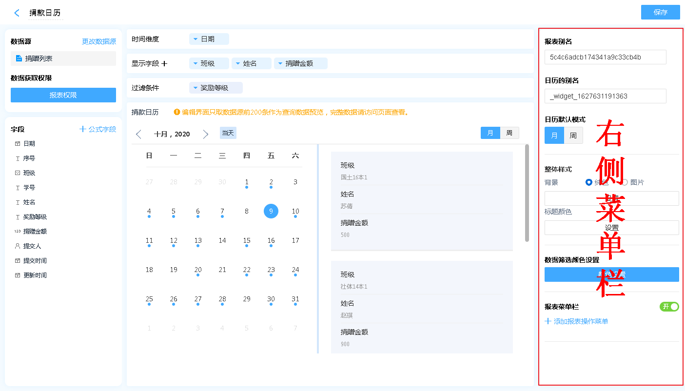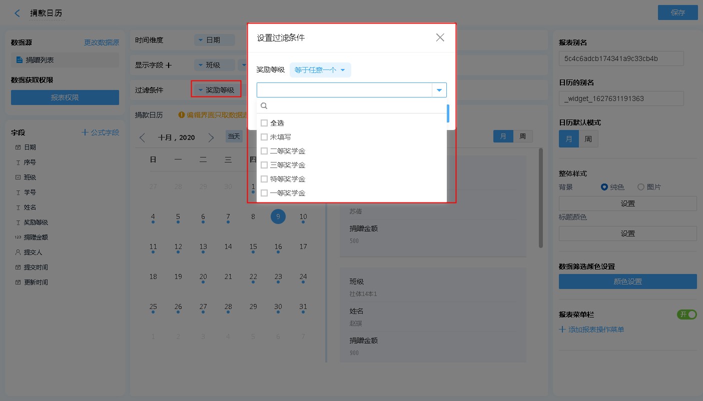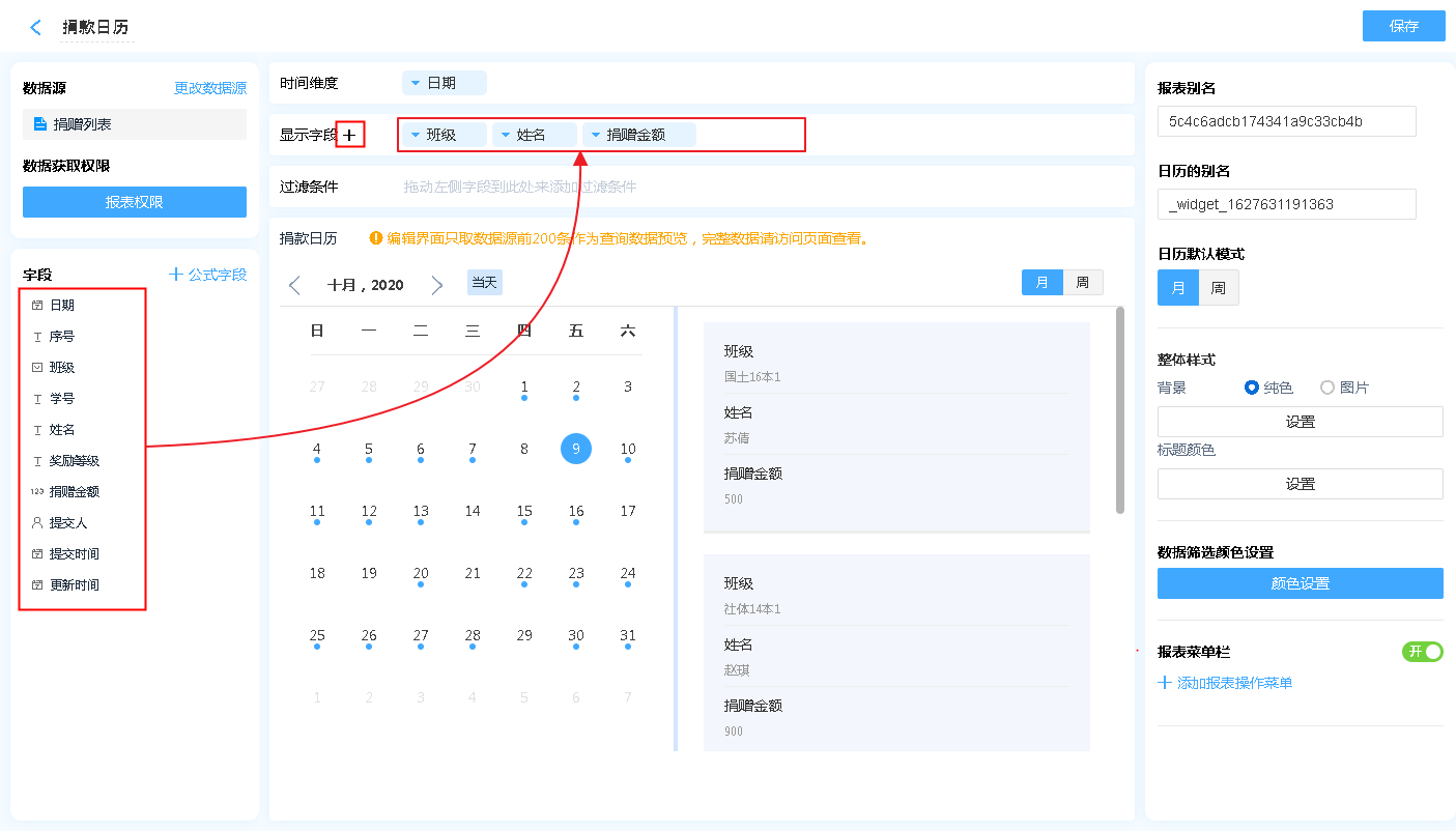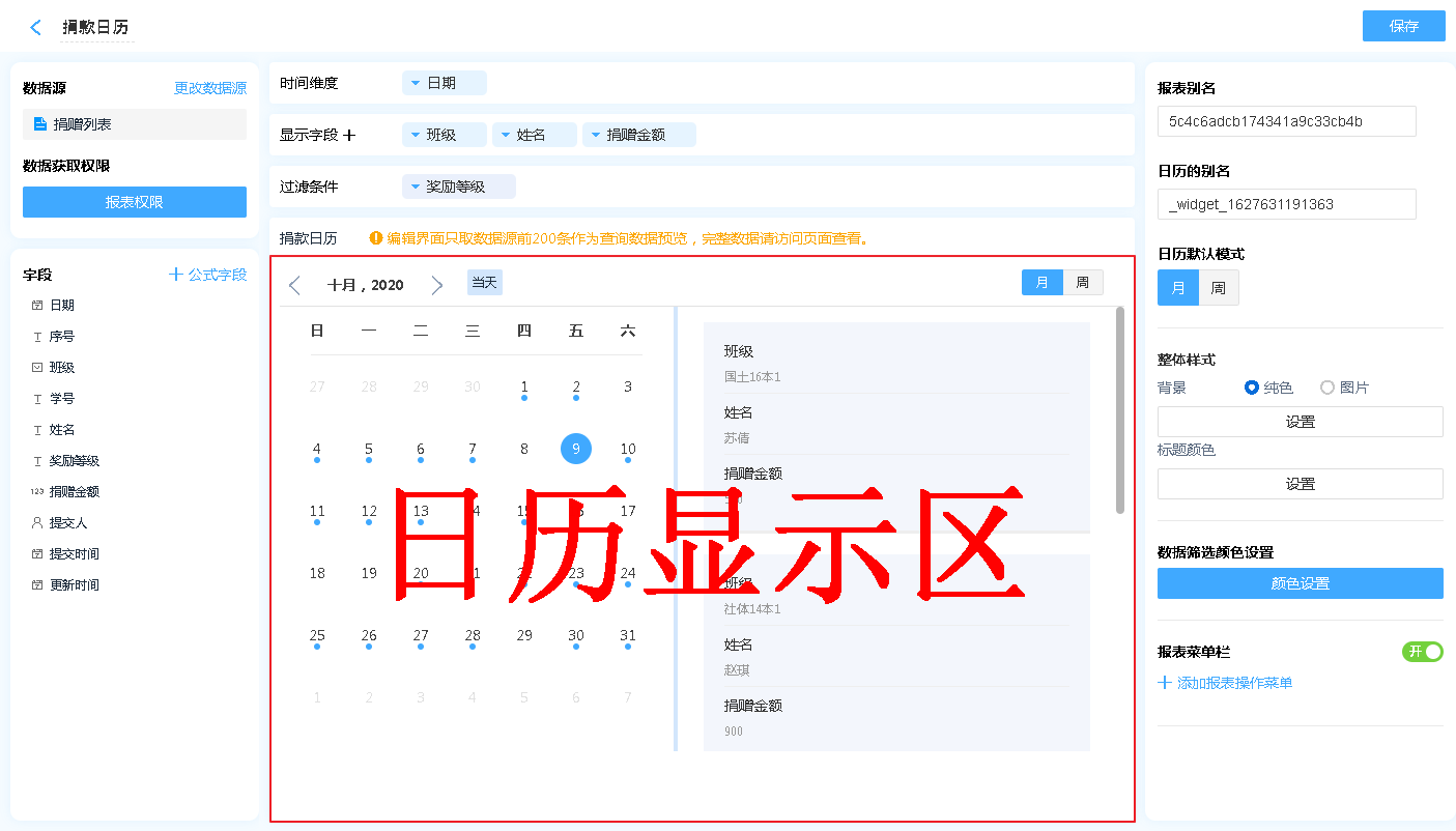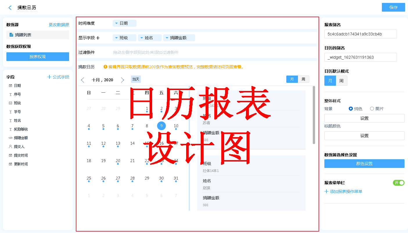 日历的设计区分为 维度、显示字段、过滤条件以及数据显示区。