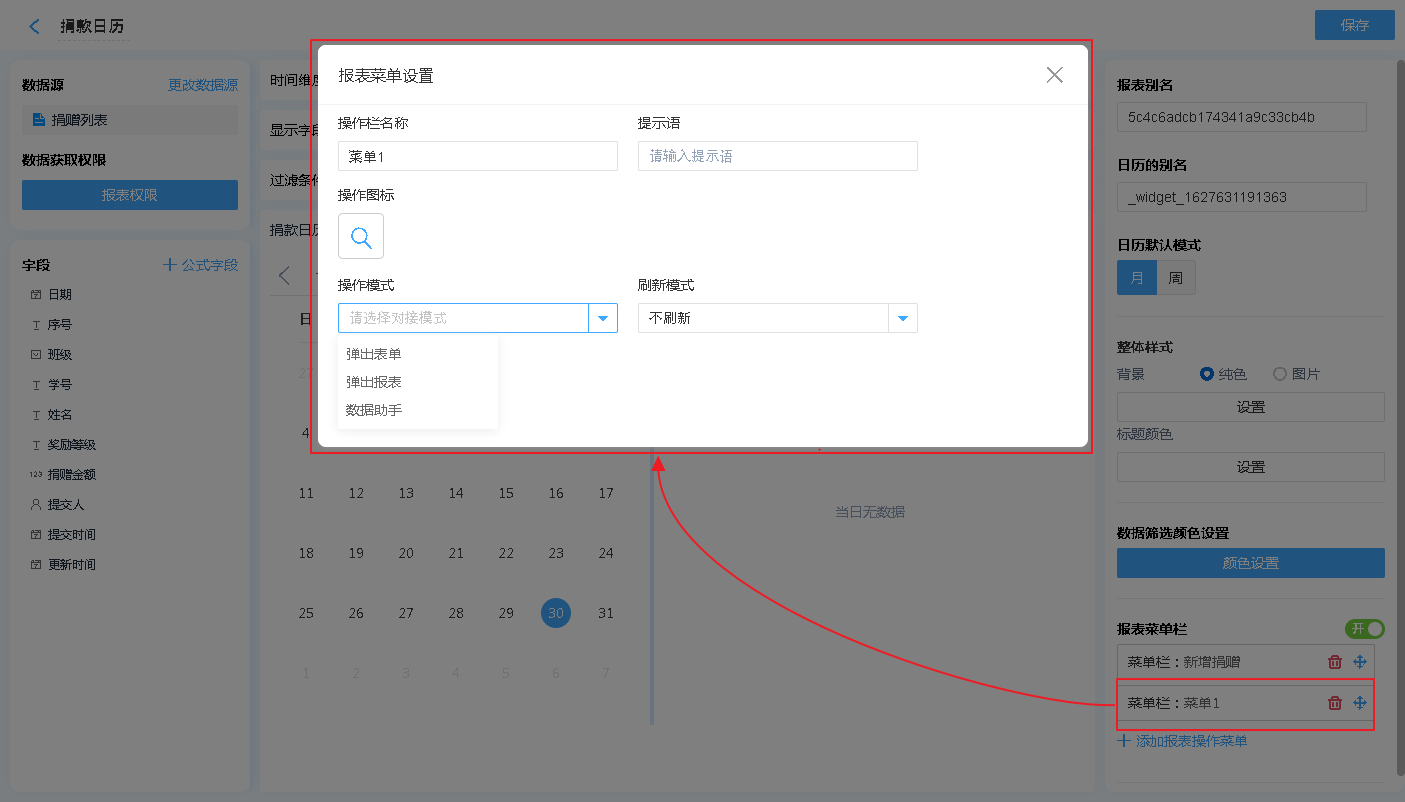 报表菜单 支持 弹出表单、弹出报表、数据助手