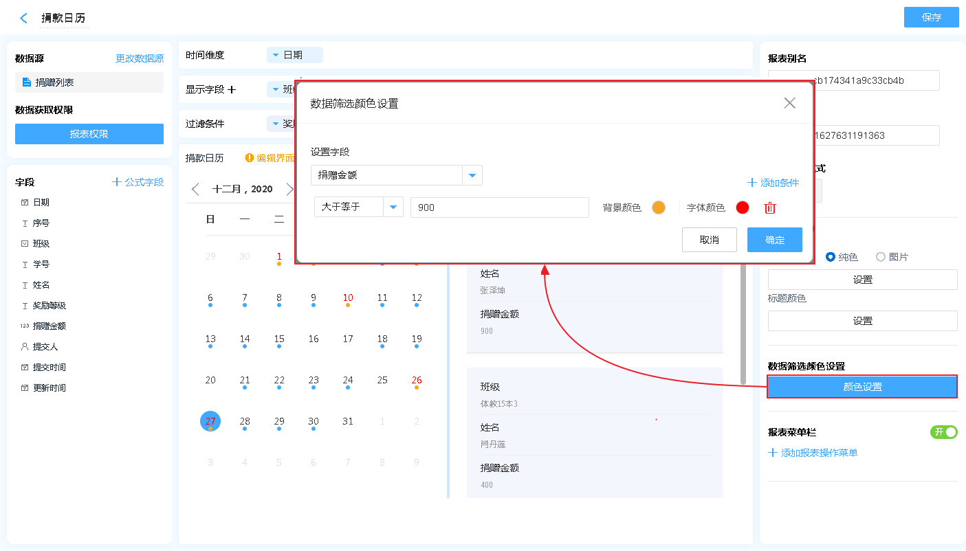 数据筛选颜色设置可设置以数据源中的某一字段为条件,添加不同条件可让日历中的日期显示为不同的颜色。