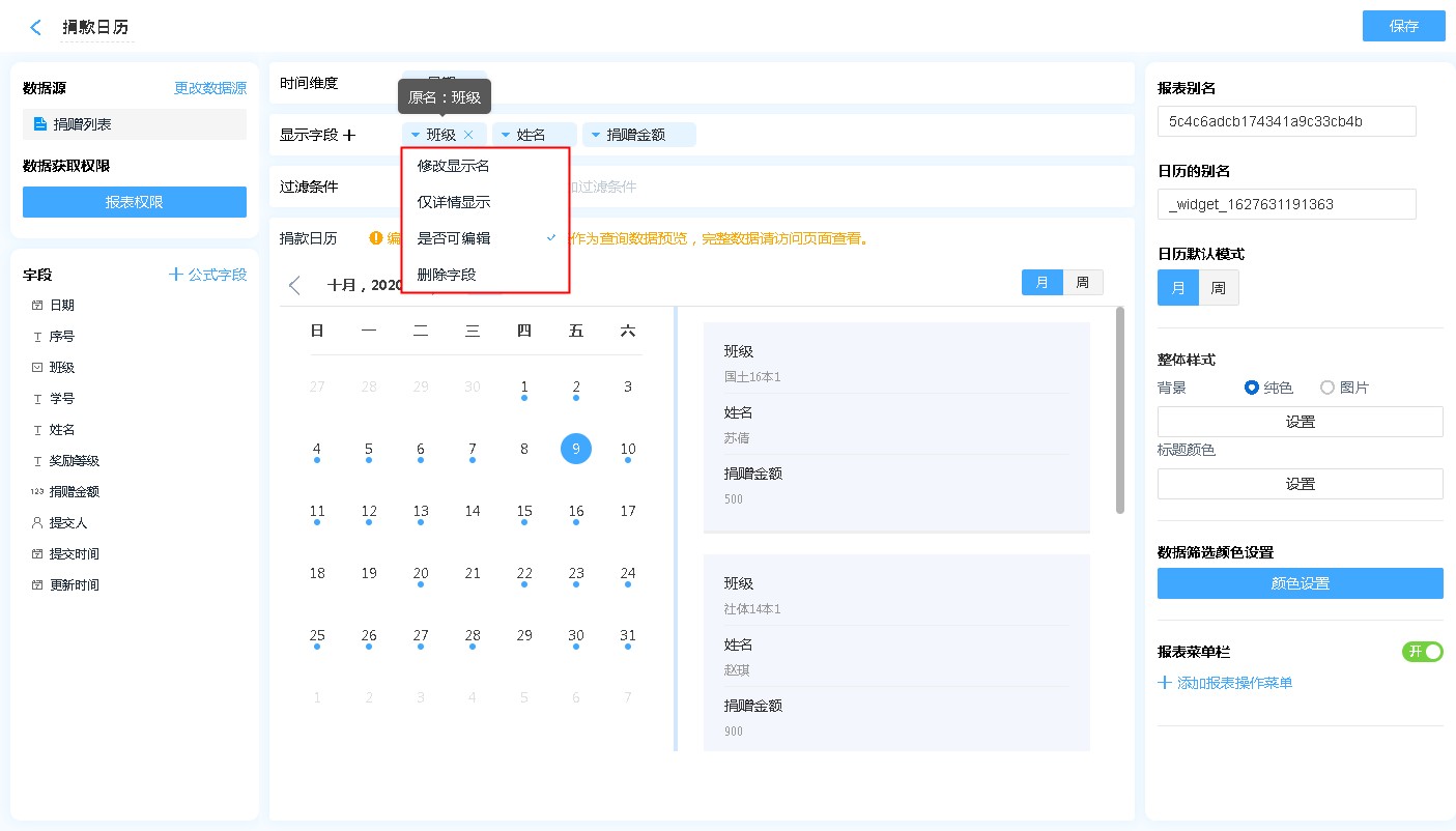• 显示名称: 字段添加进入显示字段区域后,可自行修改其在日历中的表头文字