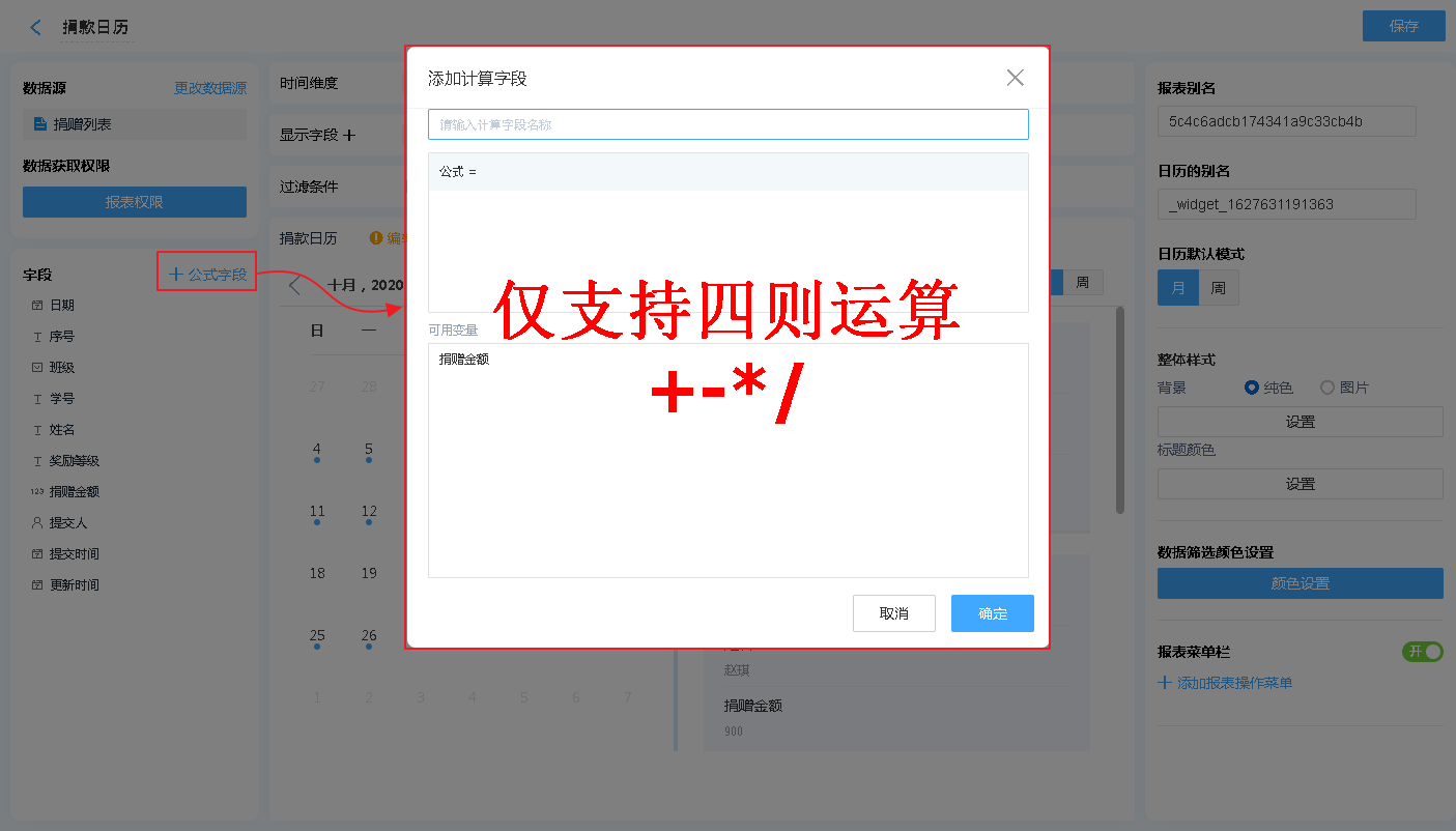 也可以通过增加公式字段,对报表中显示的内容进行简单的计算处理【支持绝大多数数学函数及+-*/四则运算】。