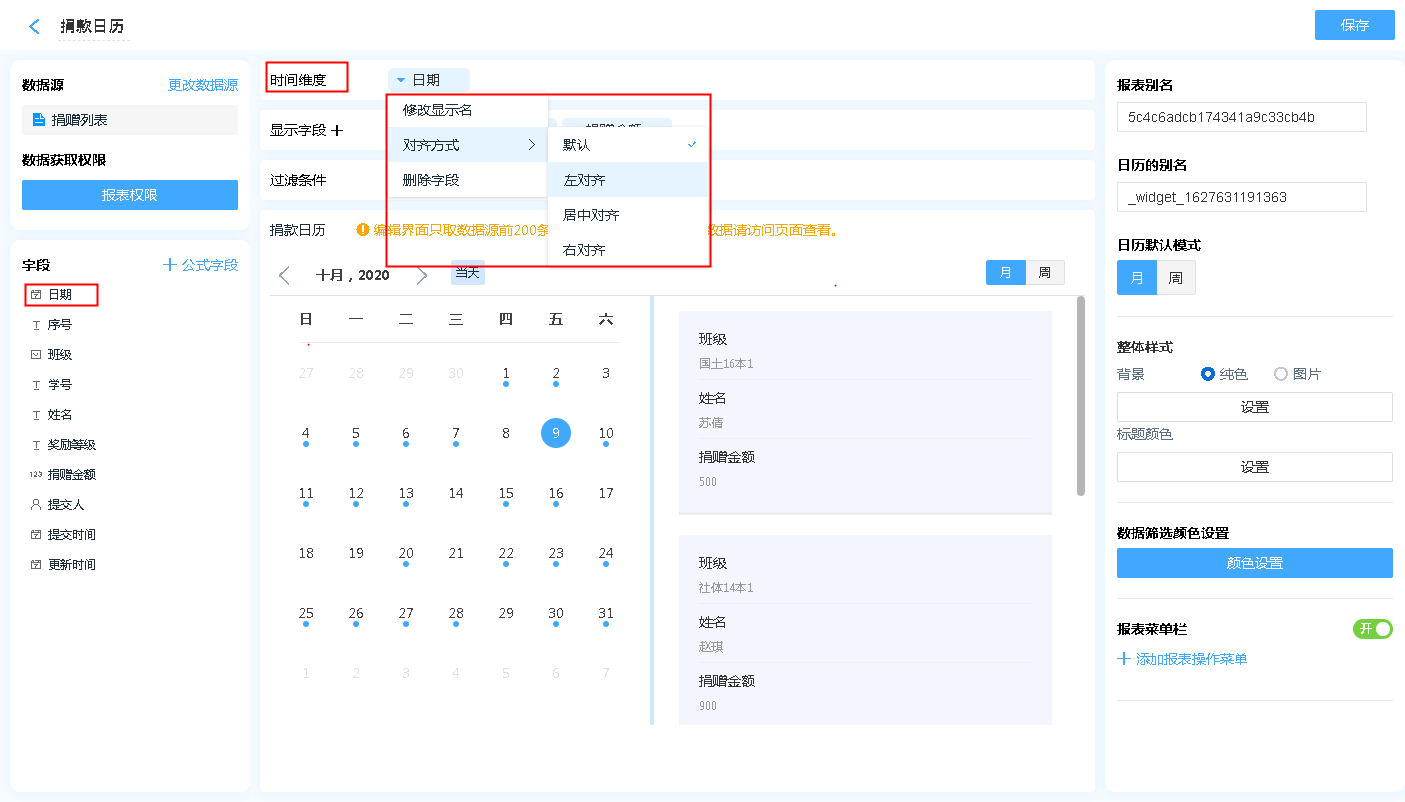 日历的时间维度只能是【表单中的日期时间】和【数据提交时间】以及【数据更新时间】这三种日期时间,时间维度只支持一个字段。