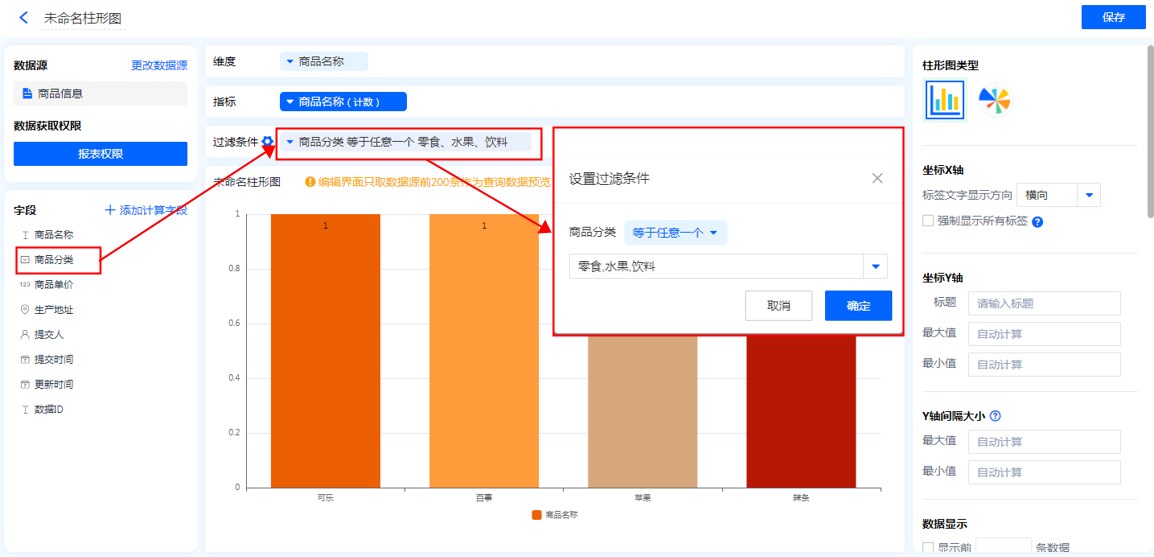 可以将柱形图中显示的数据,通过对过滤条件进行设置,只显示符合条件的数据,详见过滤条件。