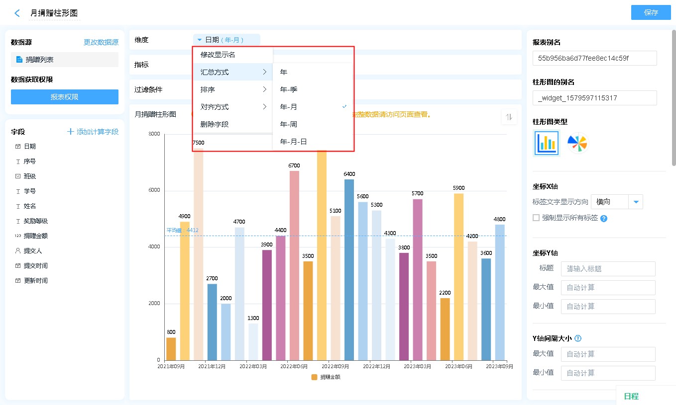 • 汇总方式: 仅日期时间字段可设置,可以设置按照何种日期格式对数据进行汇总(如:按年、按季度、按月汇总)