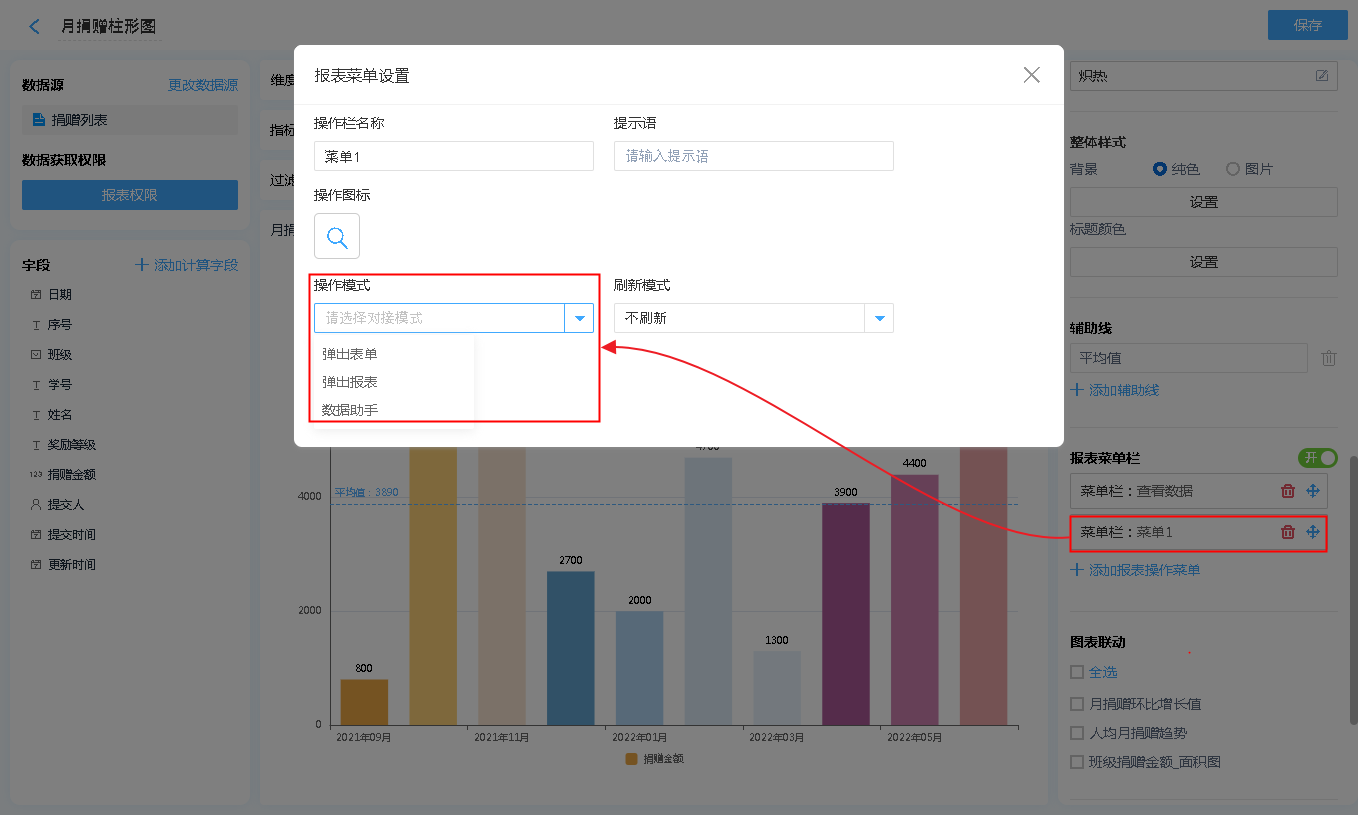 报表菜单 支持 弹出表单、弹出报表、数据助手