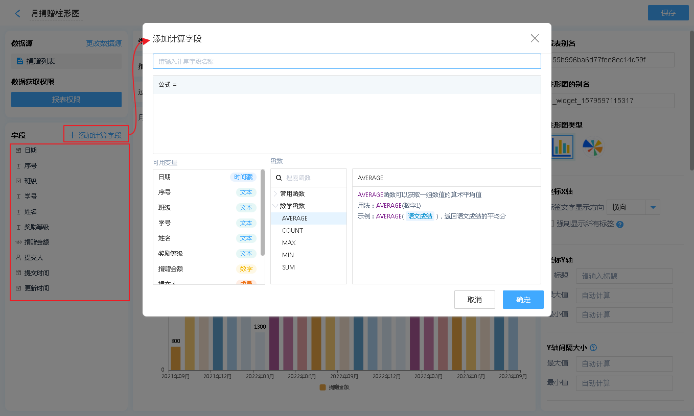 也可以通过增加公式字段,对报表中显示的内容进行简单的计算处理【支持绝大多数数学函数及+-*/四则运算】。
