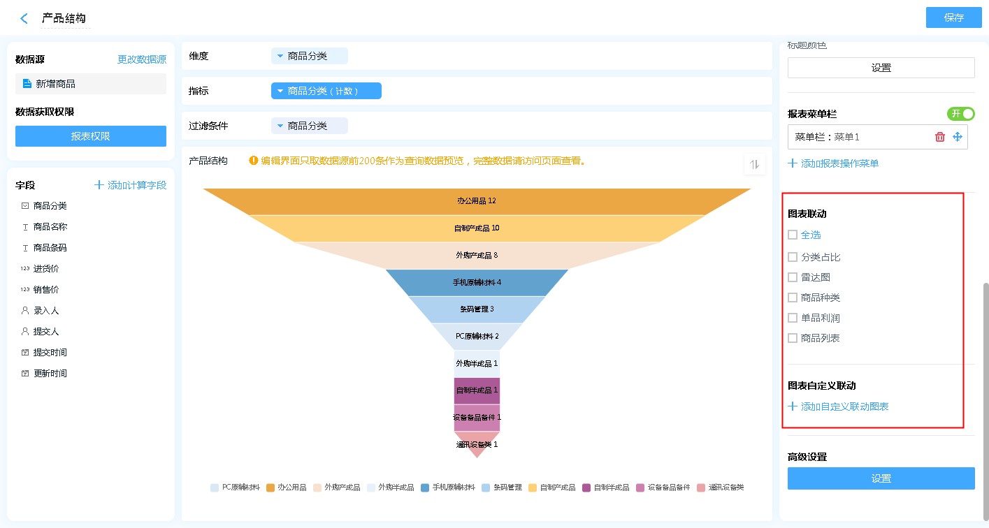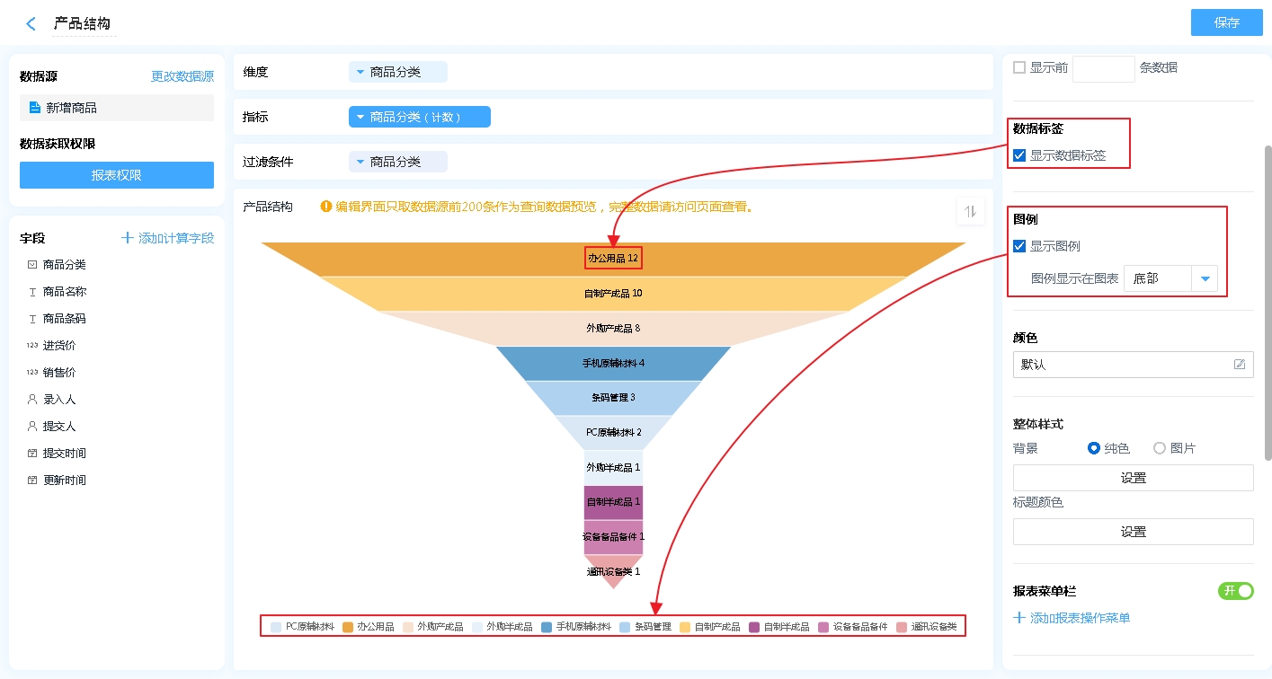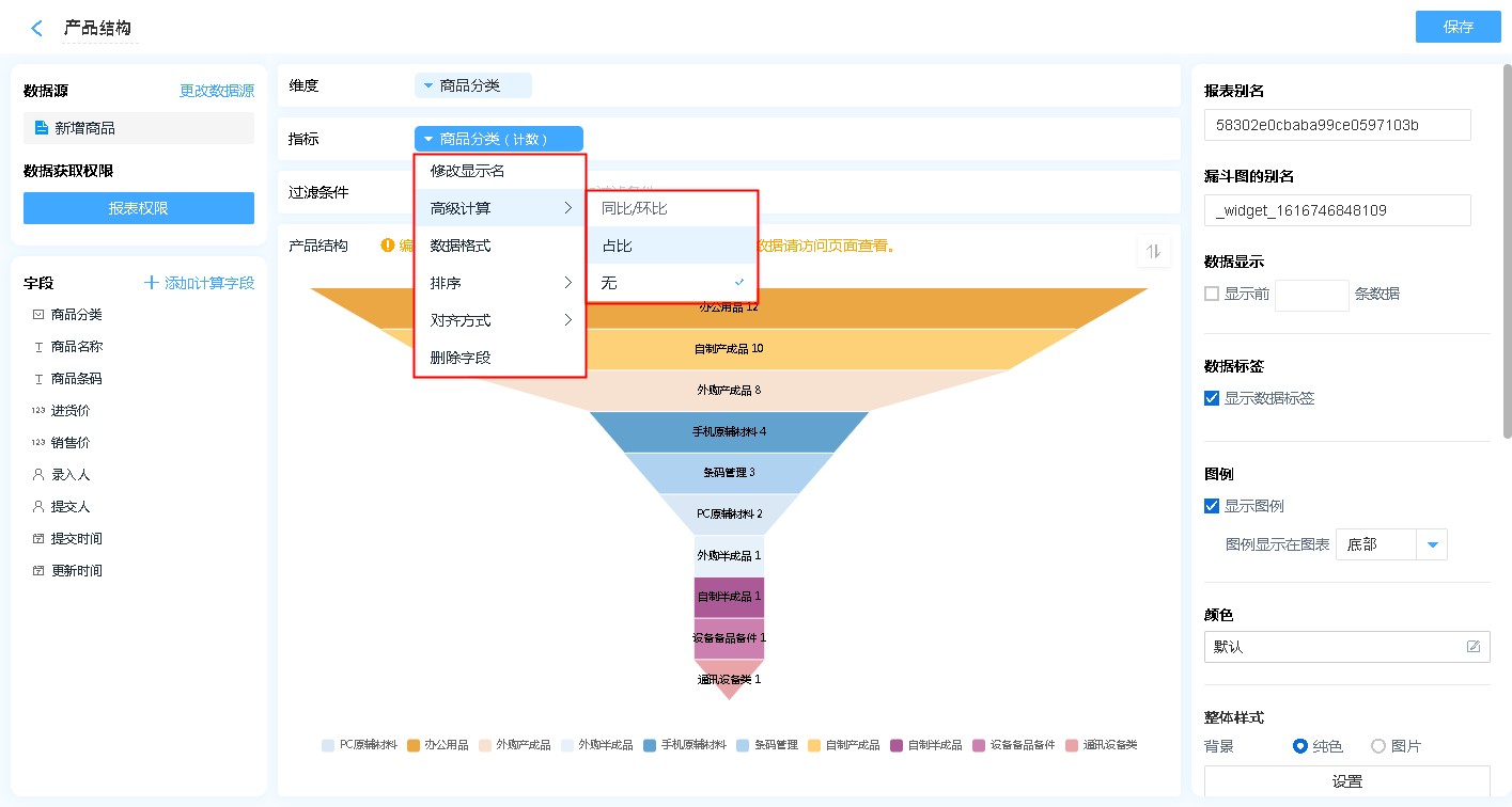 漏斗图适合有先后顺序的数据,由大到小,逐级减少的场景,如:客户转化率、产品结构等,如:进销存系统中,商品分析报表中就利用漏斗图实现的产品结构图,方便管理者了解当前产品结构。
