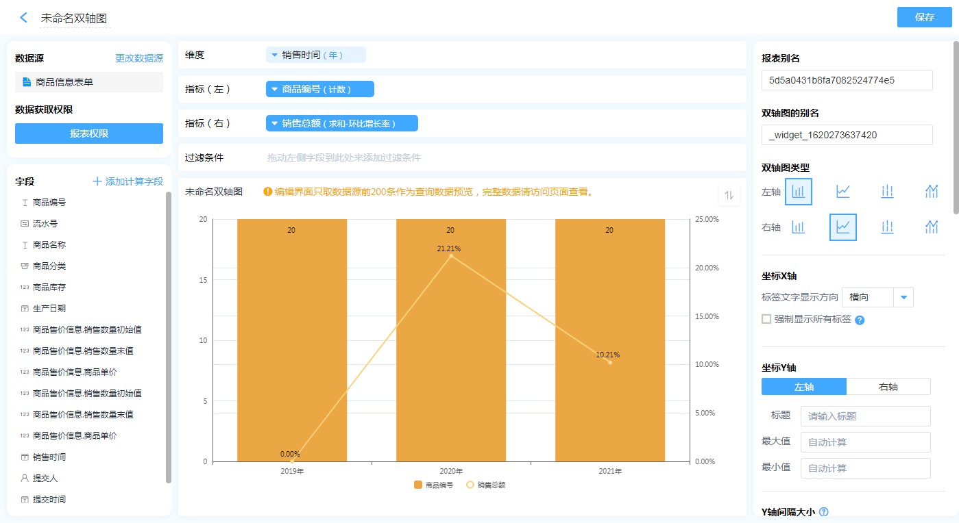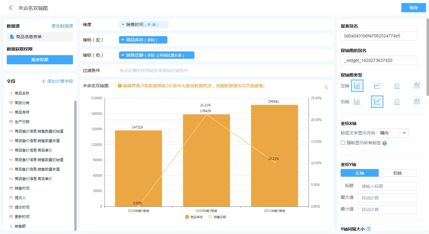 如图,想统计2021年每个季度同比2020年增长了多少,那么销售日期汇总方式为年-季,销售总额指标的汇总的方式为求和,再以销售总额为指标做上年同比增长率的计算,这样便得出了2021年同比2020年的季度增长率情况。如图可以看出,2021年三季度同比2020年三季度的同比增长率降低了11%。