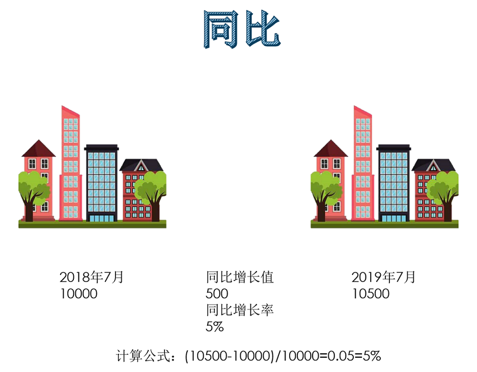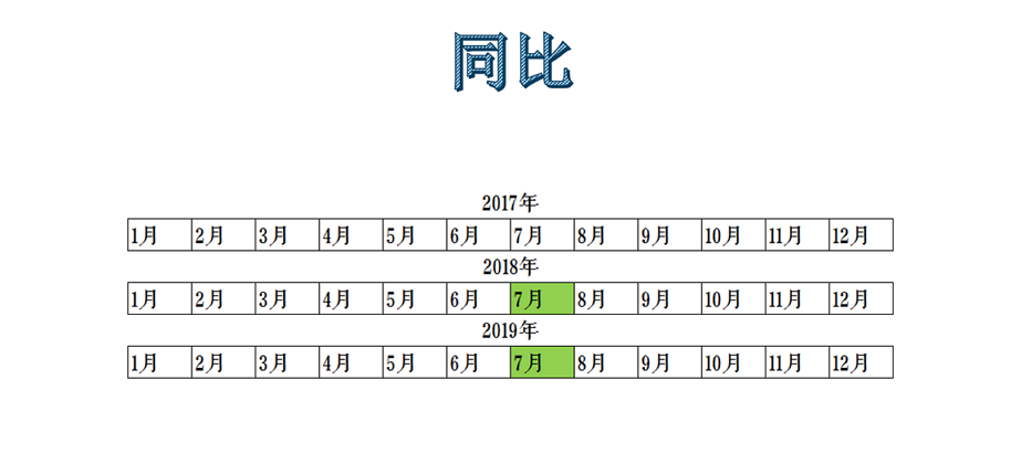 同比是指在相邻时段【如 :2018年和2019年】中的某一相同时间点【如:7月】进行比较。