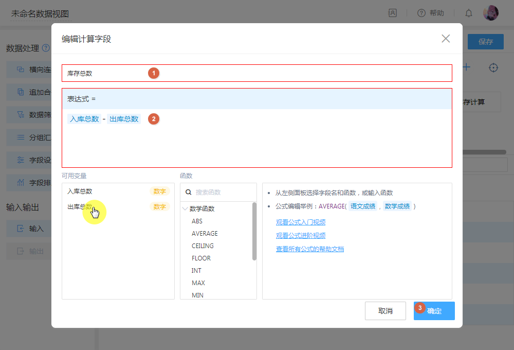 - 配置:字段设置,配置计算字段,即可通过“入库”总数与“出库”总数,计算出最新剩余库存。