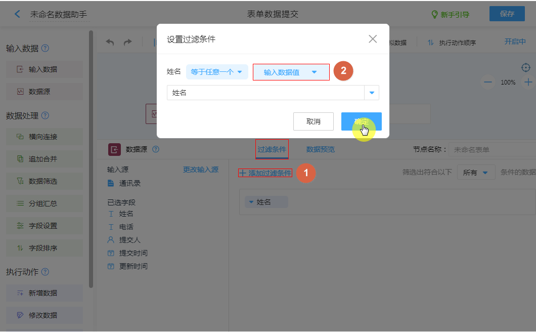 • 数据源默认配置下,是关联全表数据,可以配置“过滤条件”进行筛选符合条件的数据传入助手使用。