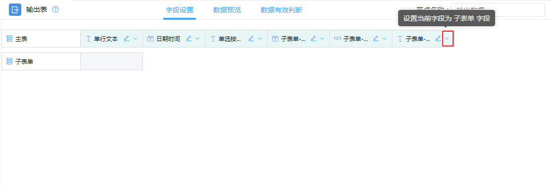 主表字段:所有字段默认为主表字段,可以将子表单字段设置为主表字段,设置为主表字段后,会将数据以主表形式展示,在调用的时候可以对应普通字段