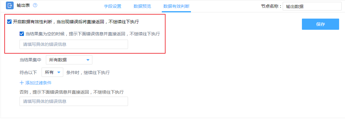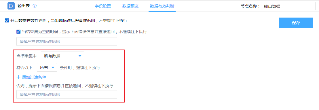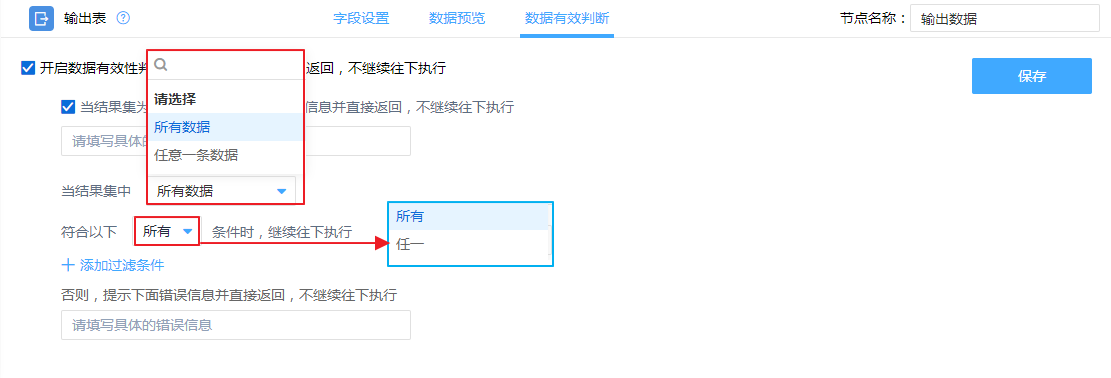 可筛选结果集的的所有数据或任一数据是否满足所有过滤条件或任一条件,满足则执行动作不满足提示错误