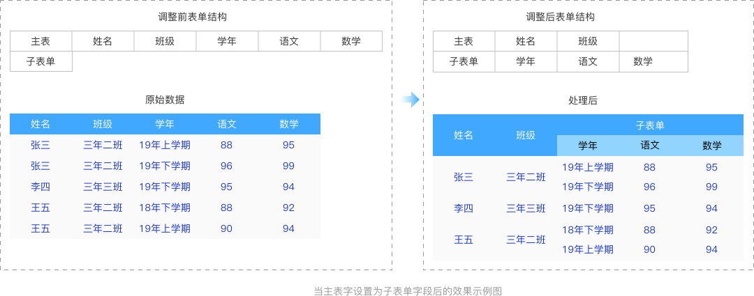 子表单字段:可以将主表字段设置为子表单字段,设置为子表单字段后,会以所有主表字段作为条件,对数据进行分组并展示在子表单当中,在调用的时候可以对应子表单字段