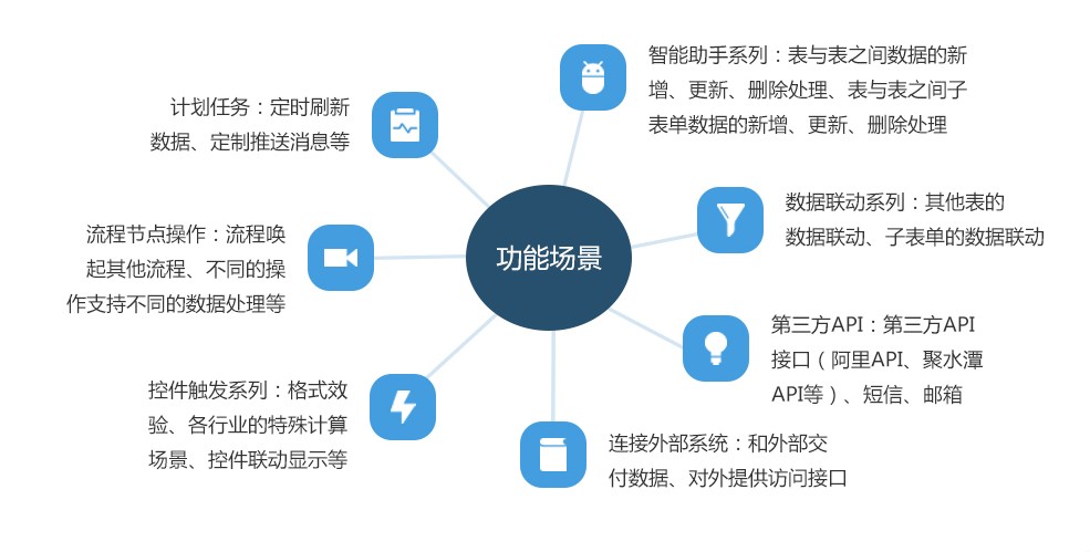 功能插件的初衷即可通过可视化的配置后能实现表单系统所做不到的功能,功能插件的功能可以灵活多变,但是其使用难度与表单一致,意在可对表单功能进行无限扩展的同时降低使用难度。